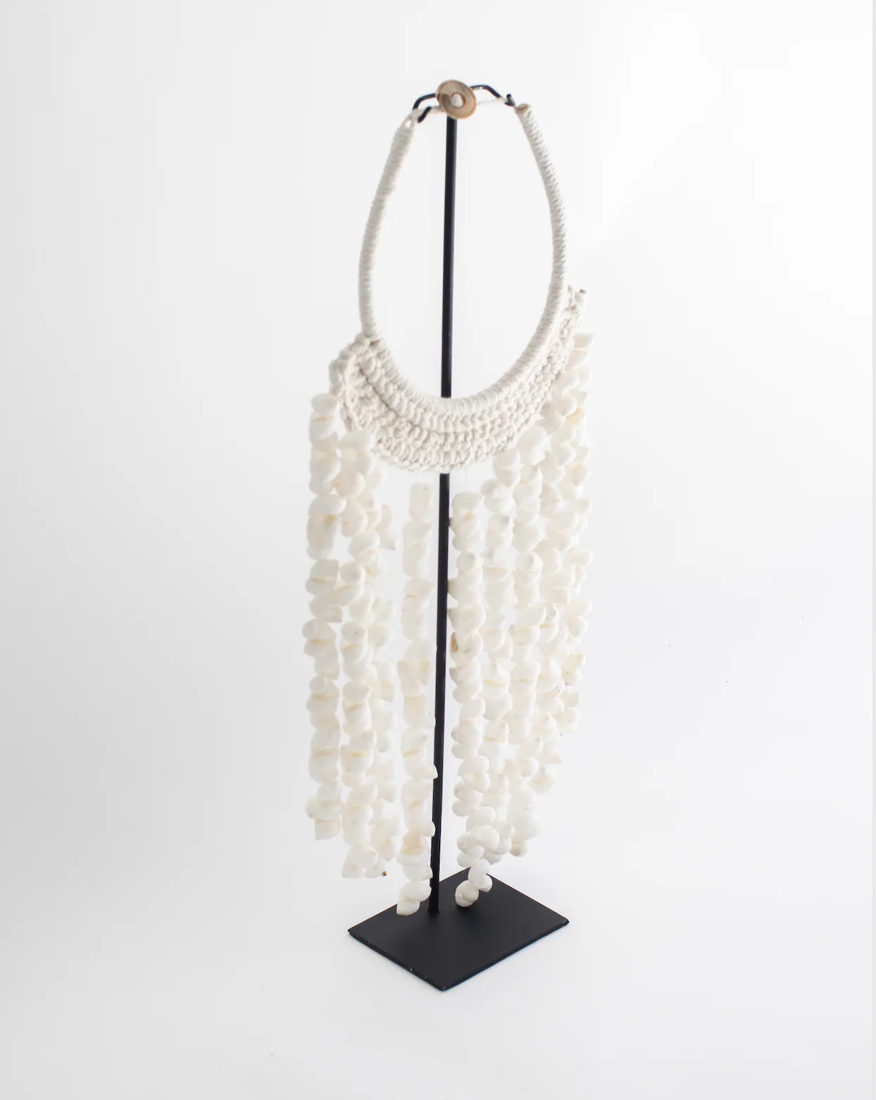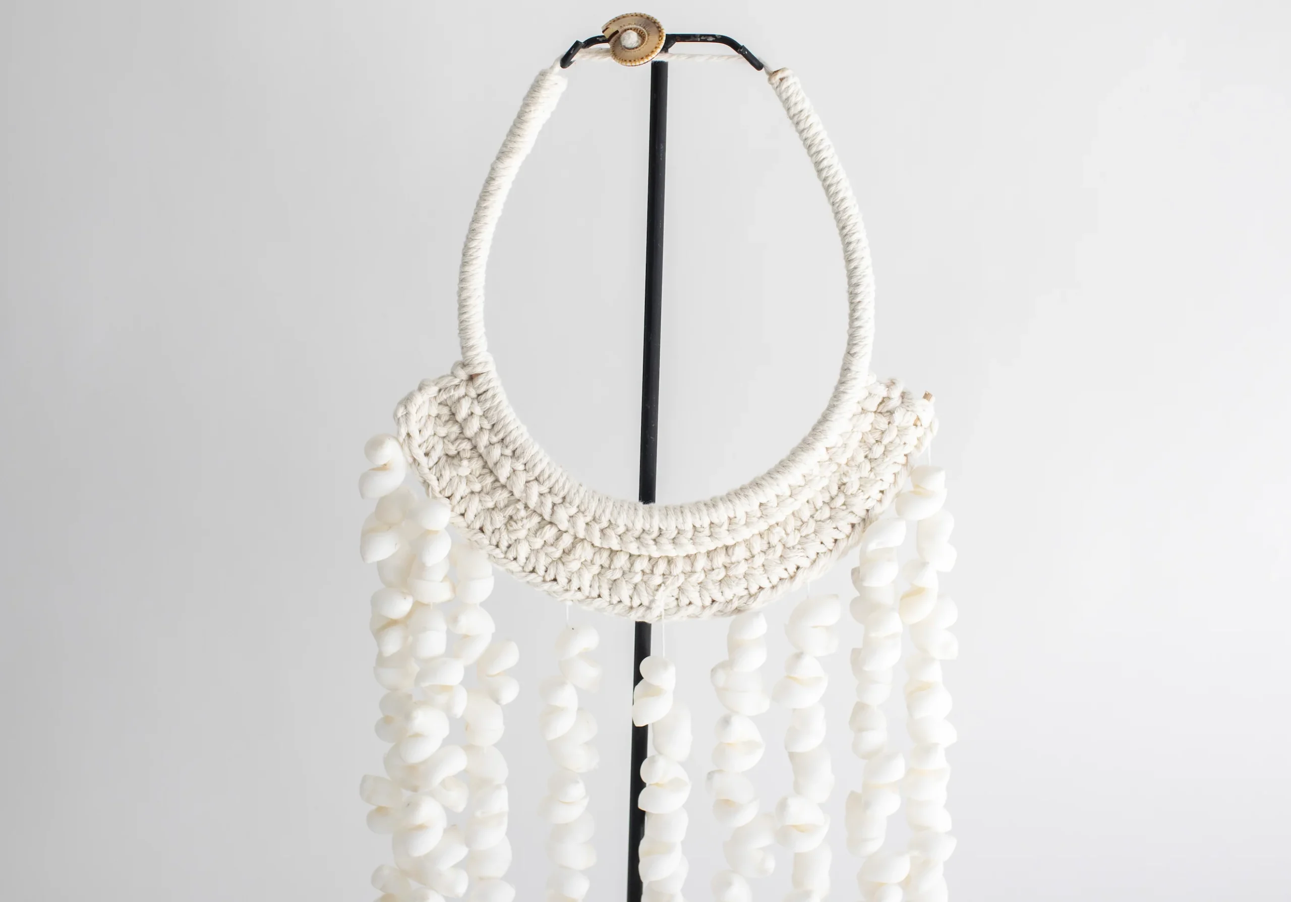 Collar decorativo hecho a mano con caracoles blancos y fibras naturales, con soporte de metal.